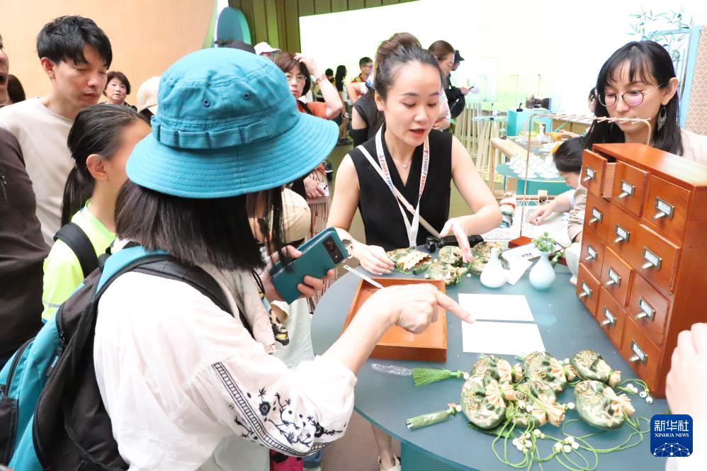 7月12日,人們在日本大阪世博會中國館“浙江周”活動上體驗中藥香囊制作。