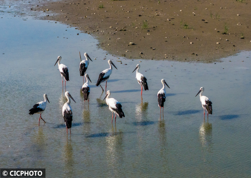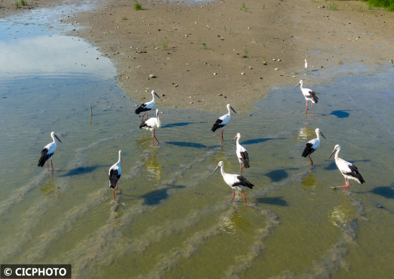 以上圖片:2025年8月26日在江蘇省宿遷市泗洪縣洪澤湖濕地溧河洼石集段拍攝的東方白鸛。(無人機照片)CICPHOTO/張連華 攝