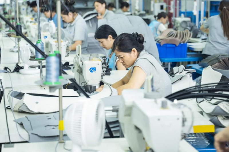 2025年8月13日,繼峰座椅(合肥)有限公司的汽車座椅生產線上,工人們正在加工座椅套。(肥東縣委宣傳部供圖)