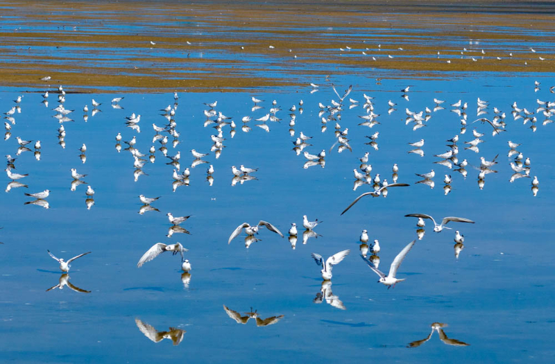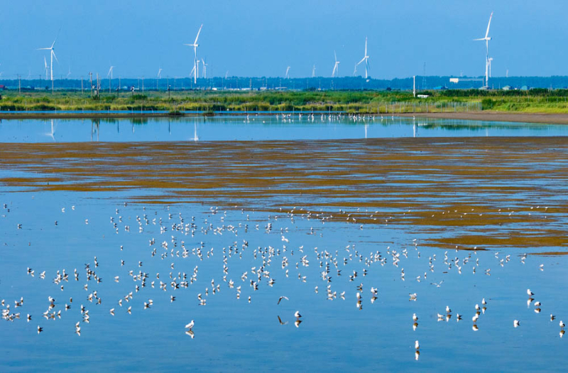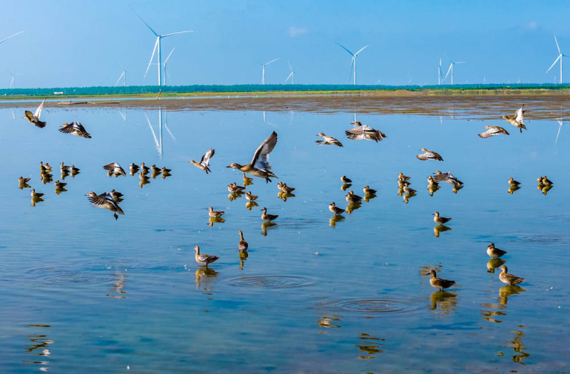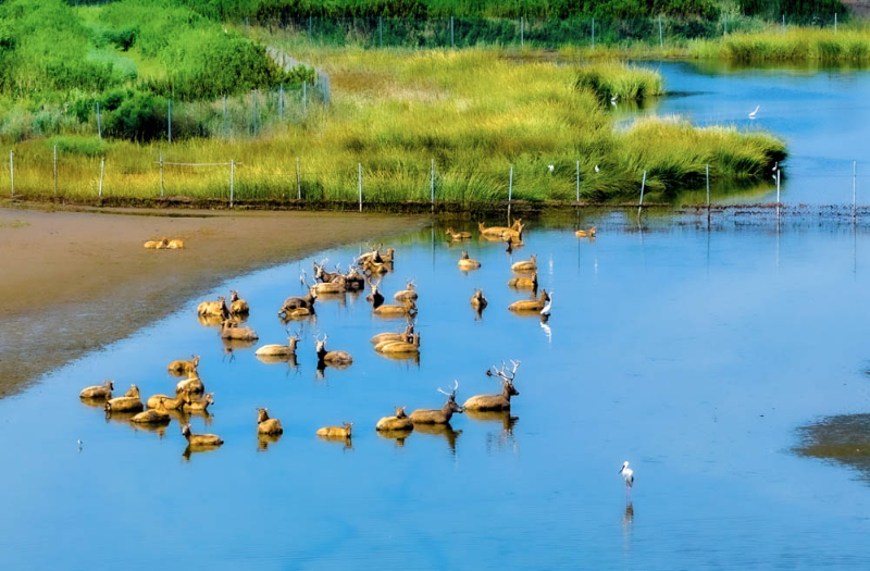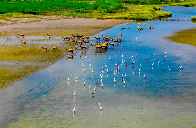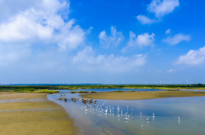 藍天白云下,大批候鳥在江蘇省東臺市條子泥濕地棲息覓食,成群麋鹿在濕地嬉戲奔跑,呈現人與自然和諧共生的生態美景。