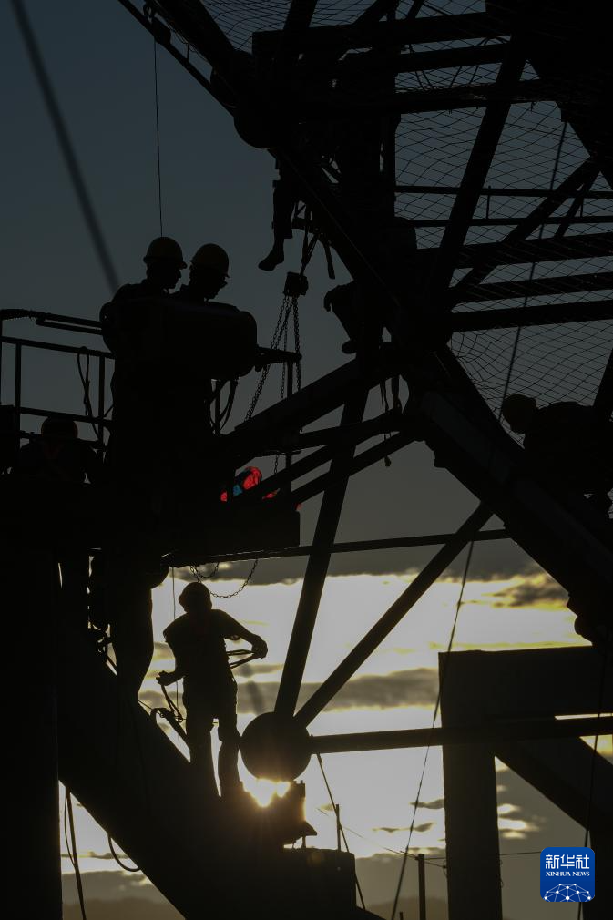 10月14日,建設者在衢麗鐵路東西巖站站房候車廳鋼網架上作業(無人機照片)。