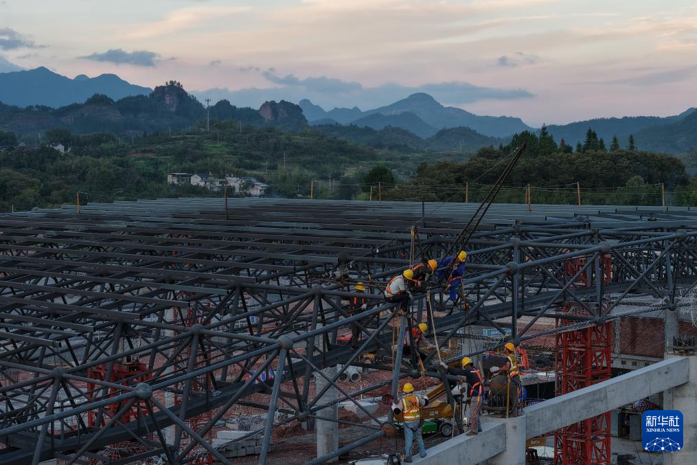 10月14日,建設者在衢麗鐵路東西巖站站房候車廳鋼網架上作業。
