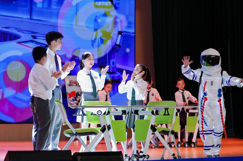 開幕式后,學生表演情景劇《火星資源采集運輸》,生動呈現了跨學科融合、個性化學習、技術賦能與創新創造未來課堂特征。劇中不僅展現了生成式人工智能輔助學習、虛實交互等前沿場景,也傳遞出“以學生為中心”的教育理念,為參會者勾勒出課堂革命的生動圖景。
