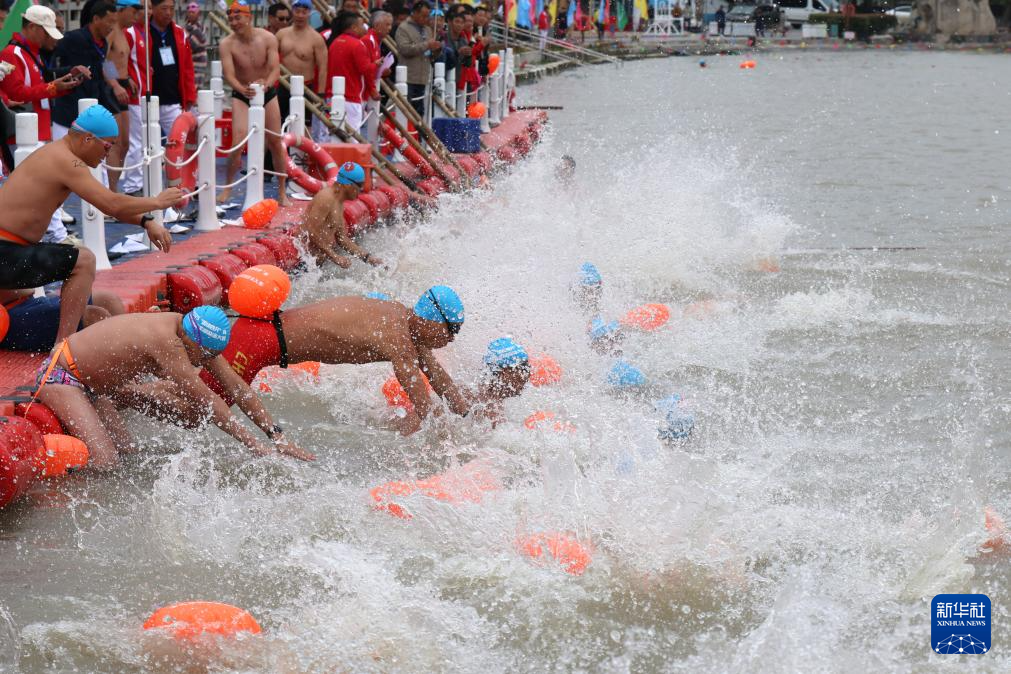10月19日,在江蘇省淮安市洪澤區漁人灣浴場,選手在比賽中入水。