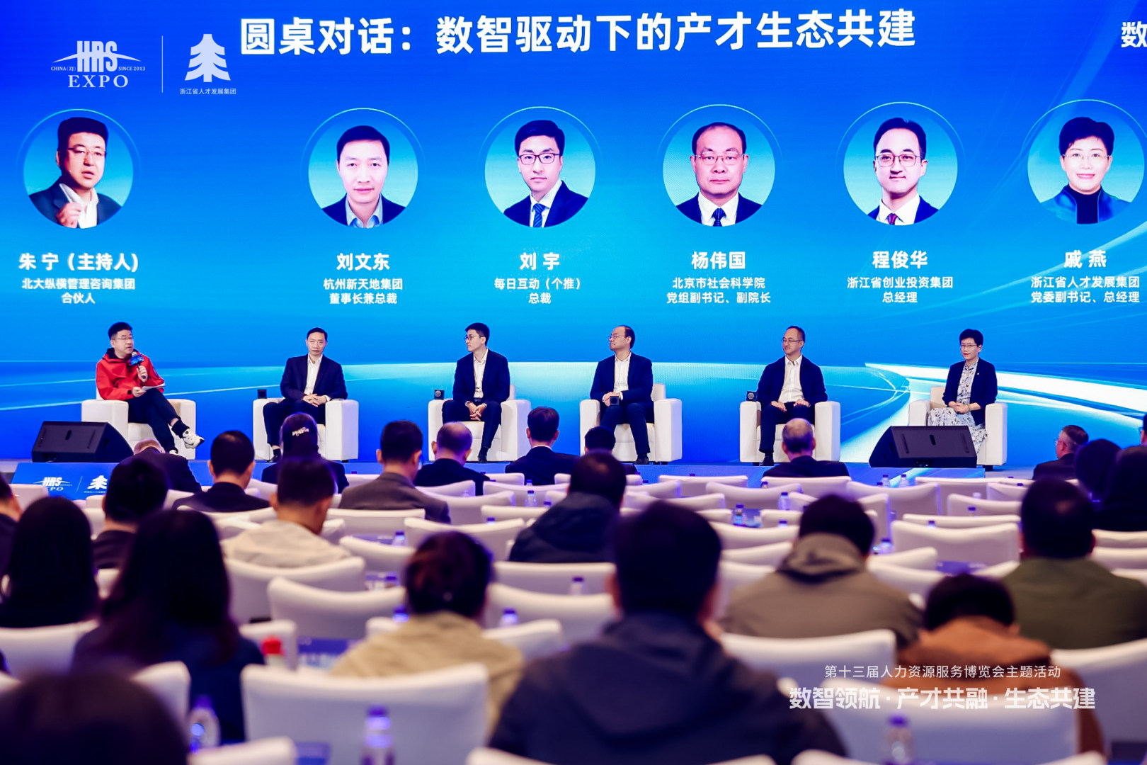 圓桌對話環節中,北京市社會科學院黨組副書記、副院長楊偉國,省創投集團總經理程俊華,省人才集團黨委副書記、總經理戚燕,每日互動(個推)總裁劉宇,杭州新天地集團董事長兼總裁劉文東及北大縱橫管理咨詢集團合伙人朱寧圍繞“數智驅動下的產才生態共建”展開深入討論,并達成核心共識:強化“四鏈”融合,共建開放、包容、協同的創新生態,積極應對數智化對產業與人才關系的重塑,加快形成以人才創新為核心驅動力的新發展格局。